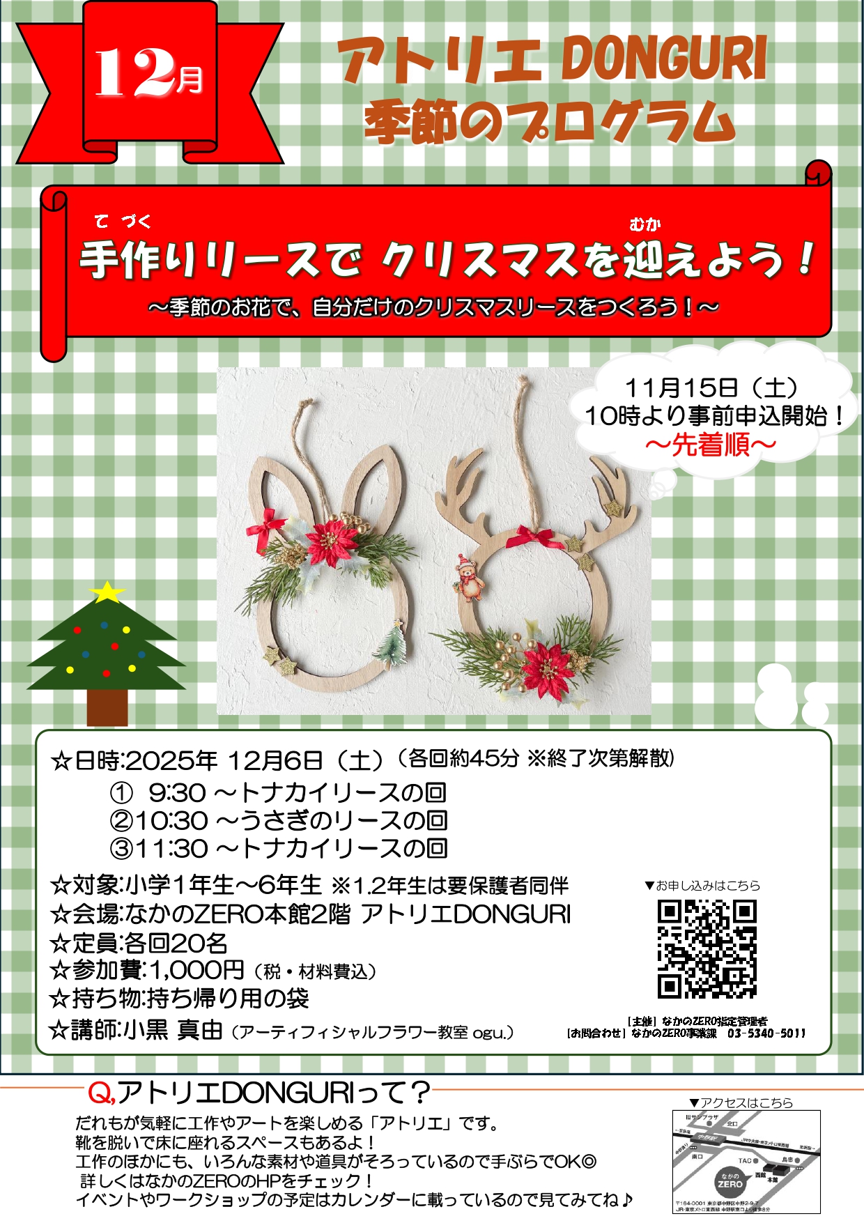 アトリエDONGURI 12月季節のプログラム「手作りリースでクリスマスを迎えよう!」